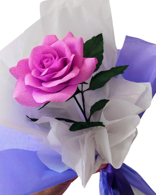 Características: Rosa hecha en papel crepe italiano de alta calidad. Todas nuestras rosas son casi reales e inmarchitables, cada pétalo es cortado a mano cuidadosamente.